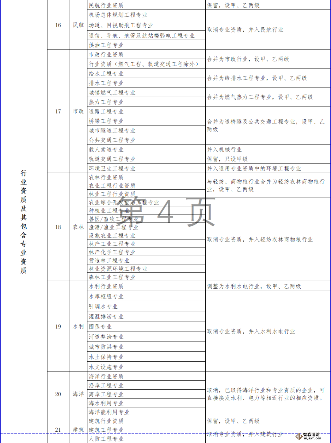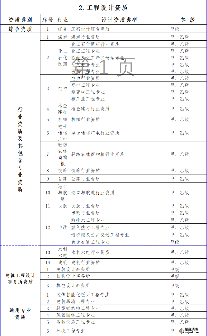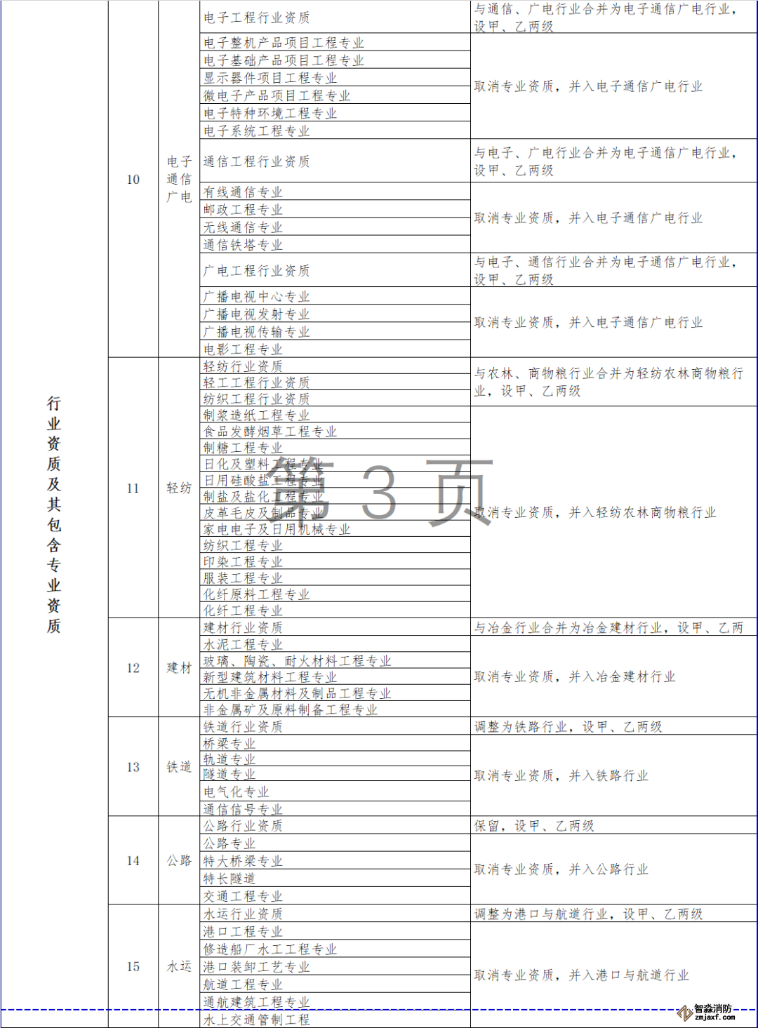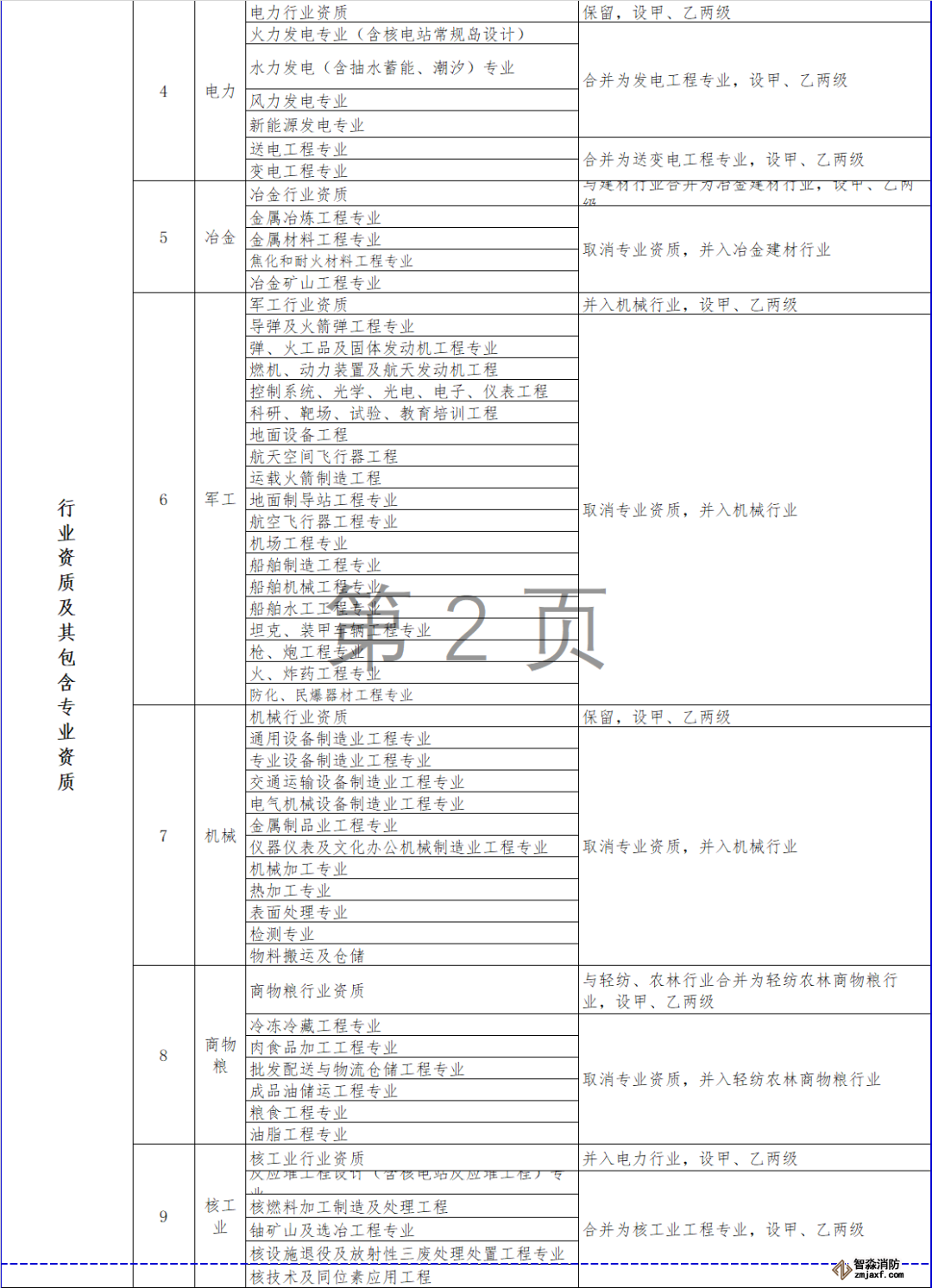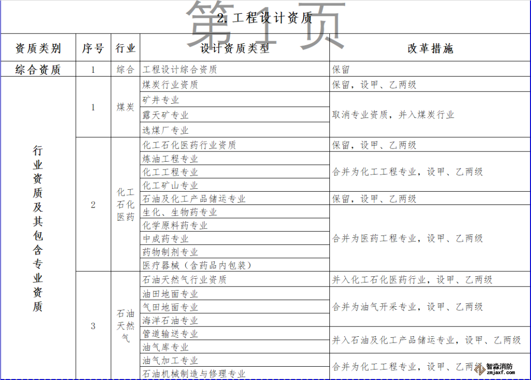 對部分行業(yè)資質(zhì)進行整合,其中,冶金行業(yè)與建材行業(yè)合并為冶金建材行業(yè)資質(zhì),輕紡行業(yè)、農(nóng)林行業(yè)、商物糧行業(yè)合并為輕紡農(nóng)林商物糧行業(yè),電子行業(yè)、通信行業(yè)、廣電行業(yè)合并為電子通信廣電行業(yè),石油天然氣行業(yè)并入化工石化醫(yī)藥行業(yè),軍工行業(yè)并入機械行業(yè),核工業(yè)行業(yè)并入電力行業(yè),資質(zhì)等級壓減為甲、乙兩級,原丙級資質(zhì)并入相應行業(yè)乙級資質(zhì)。
