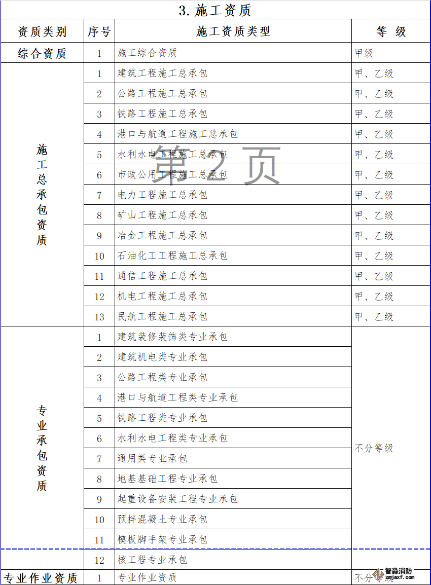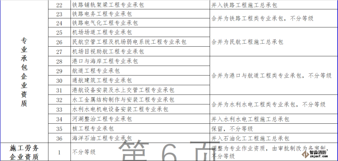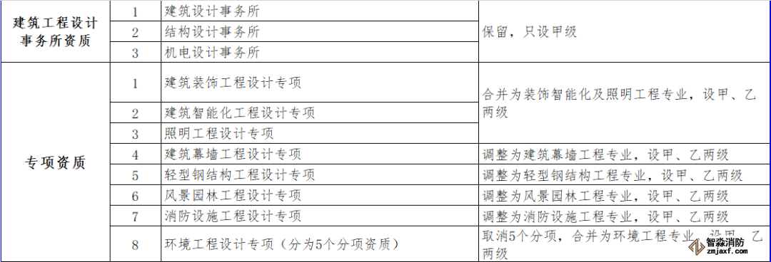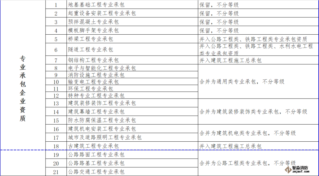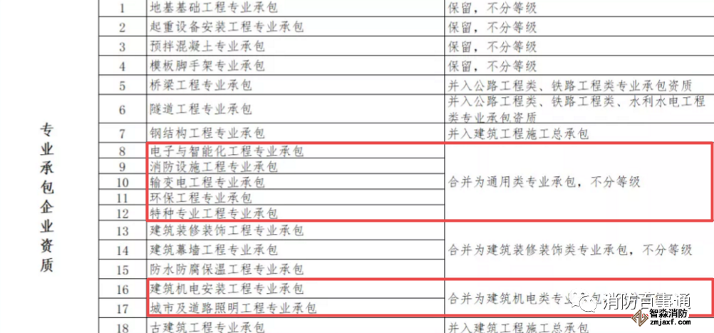 消防設施施工專業(yè)承包資質(zhì)和其他幾項資質(zhì)合并為通用類專業(yè)承包,不分等級。