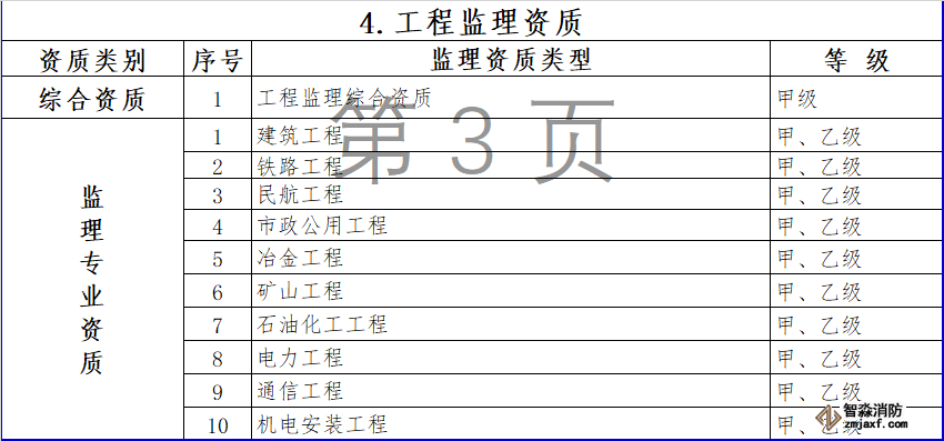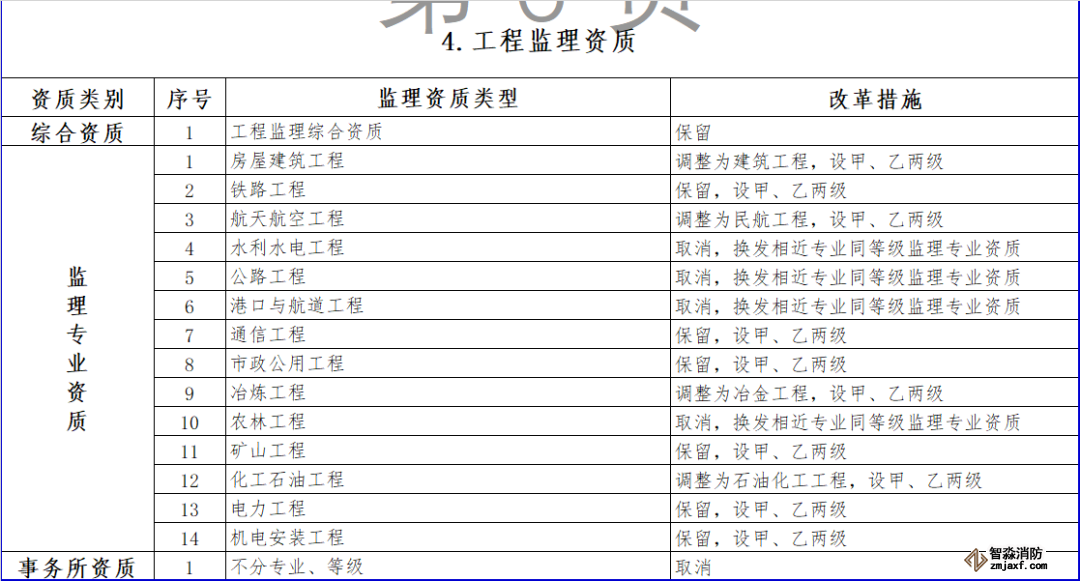 (四)工程監(jiān)理資質(zhì)。保留綜合資質(zhì)。取消水利水電工程、公路工程、港口與航道工程等專業(yè)資質(zhì),其資質(zhì)要求執(zhí)行有關(guān)行業(yè)主管部門規(guī)定。取消農(nóng)林工程監(jiān)理資質(zhì),建設單位委托農(nóng)林工程監(jiān)理業(yè)務時,不再作資質(zhì)要求。上述4個監(jiān)理專業(yè)資質(zhì)取消后,相關(guān)企業(yè)可以換發(fā)相近專業(yè)同等級監(jiān)理專業(yè)資質(zhì)。監(jiān)理專業(yè)資質(zhì)等級壓減為甲、乙兩級,原丙級資質(zhì)并入相應專業(yè)的乙級資質(zhì)。取消事務所資質(zhì)。