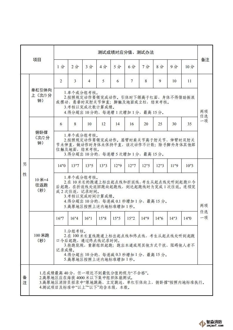 (三)體能測試和崗位適應性測試。按照《國家綜合性消防救援隊伍消防員招錄體能測試、崗位適應性測試項目及標準》執行(見附件5)。體能測試實行量化評分,單項設最高分(15分),總成績最高40分,有一個單項“不合格”的予以淘汰。崗位適應性測試有一個單項達不到“一般”標準的予以淘汰。