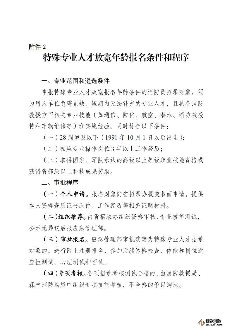 申請特殊專業人才放寬年齡報名的,由本人于9月10日前(以信件寄出郵戳時間為準)向省級消防員招錄工作辦公室(以下簡稱“省級招錄辦”)寄送書面申請和相關證件證書復印件,經省級招錄辦組織審核、公示并報應急管理部審批同意后,辦理網上注冊報名。標準條件和辦理程序見附件2。