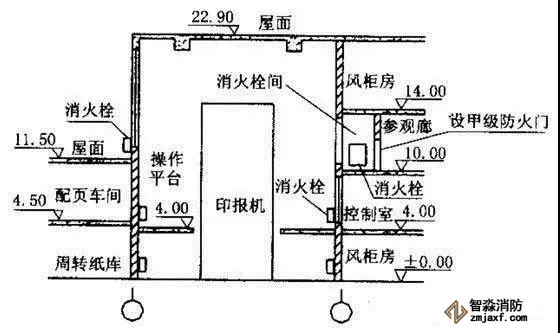 對于儲備紙庫,以消防員站在0.00m標高地面上,按式(1)計算,水槍充實水柱應在16.7~20.5m之間。故向建筑專業提出要求,在紙庫內墻10.00m標高處增加一圈馬道,在馬道設置消火栓,以減少充實水柱長度,見圖1。印報機廠房在0.00m標高和4.00m標高各有一個工作平臺。以消防員站在4.00m標高平臺,按式(1)計算,水槍充實水柱應在20.6~25.2m之間。故考慮在廠房北邊11.50m標高屋面上設置消火栓,通過廠房高大的窗戶向室內噴水。在廠房南邊10.00m標高的參觀廊(屬于另一防火分區)設專門的消防栓小間,供消防員使用,消火栓小間用甲級防火門與參觀廊隔開,見圖2。按圖2設置消火栓,水槍充實水柱為15m,在11.50m標高屋面上水槍上傾角為45°,在10.00m標高的消火栓小間水槍上傾角為53°,就可以滿足滅火要求。