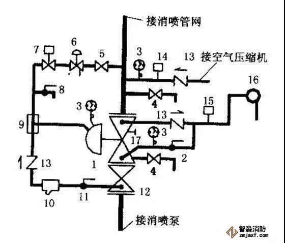 注:1、主閥體 2、報警測試閥 3、壓力表 4、排水閥 5、重置閥 6、 PORV壓力控制導閥 7、電磁閥 8、緊急啟動閥 9、加速器 10、過濾器 11、球閥 12、水源控制閥 13、止回閥 14、低氣壓監測開關 15、高壓水流報警開關 16、水力警鈴 17、積水測試器